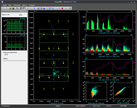 Измерительные АЭ каналы содержат программно устанавливаемые частотные полосовые фильтры, имеют фиксированные и автоматические уровни порогов, предусмотрена возможность регистрации формы волн в каждом канале, автоматическое тестирование акустических преобразователей.